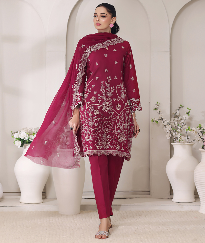 Embroidered Chikankari 3 piece unstitched suit – Maroon Majesly